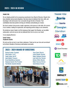We are deeply grateful for the unwavering commitment of our Board of Directors. Despite their busy schedules and personal obligations, they have chosen to dedicate their time, skills, and knowledge to the betterment of our community through the Barrie Chamber. Their contributions have been pivotal in driving our initiatives and achieving our mission.