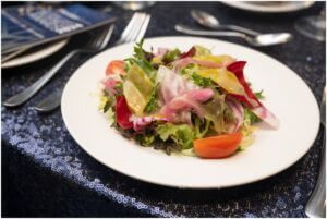 Appetizer: Baby greens salad with honey roasted pears, pickled red onions, and crispy onion straws drizzled with Sicilian lemon balsamic (Olive Oil Co. Inc.) vinaigrette