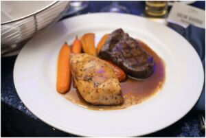 Entrée: Spinach and Brie stuffed chicken breast topped with white wine cream sauce, served with roasted garlic mashed potatoes and chef’s seasonal vegetables roasted in Roasted Onion Olive oil (Olive Oil Co. Inc.)