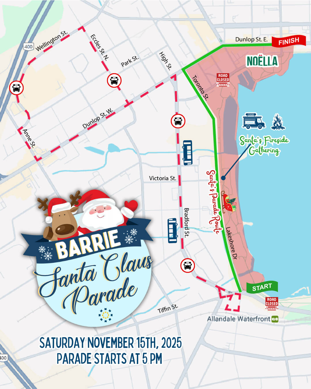 - The 76th running of the Barrie Santa Claus Parade: Starting at 5pm, traveling north bound on Lakeshore Drive, from Tiffin Street, up through Toronto Street, and eastbound on Dunlop Street to the end at Poyntz Street. See the map below. For everyone’s safety, please avoid standing on the median between the north and southbound lanes on Lakeshore Drive—enjoy the parade from the lakeside instead!